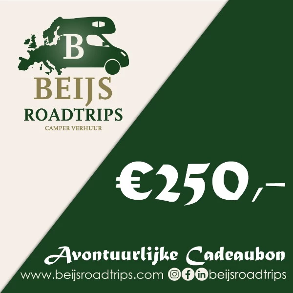 Met een Beijs Roadtrips cadeaubon geef je meer dan alleen een cadeau; je geeft een belevenis, een verzameling van herinneringen die een leven lang meegaan. Onze flexibele cadeaubonnen zijn inwisselbaar voor onze diverse campermodellen en routes, zodat de ontvanger altijd zijn of haar droomreis kan realiseren. Geef een bijzonder cadeau dat gegarandeerd in de smaak valt! Deze unieke cadeautip opent deuren naar onvergetelijke bestemmingen en de ultieme vrijheid van spontaniteit.